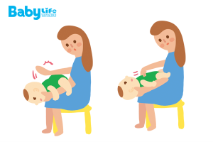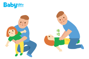大人以一手臂撐住小孩身體、手指扶住下巴,讓寶寶臉部朝下,頭比胸低的依靠在大人的大腿上,並以另一手掌根於寶寶兩肩胛骨中點處連續拍打5下。